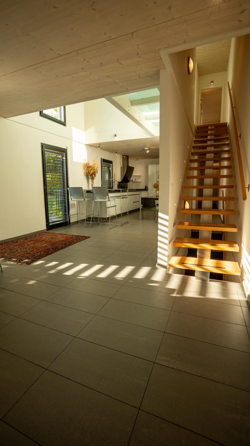 On the ground floor, you will find a spacious, light-filled living room with an open-plan, fully equipped kitchen and an office with its own bathroom.