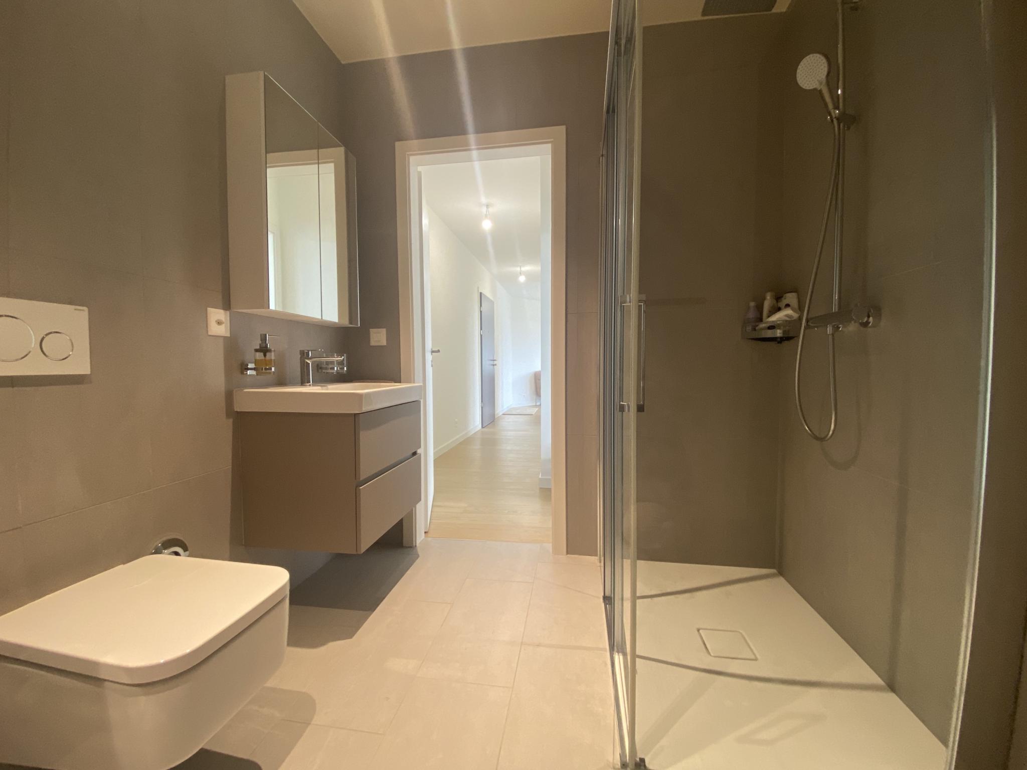 The living space has been designed to create a seamless transition between indoors and outdoors: the kitchen, living room, and two bedrooms all have direct access to a spacious 15.5 m² balcony-terrace, offering breathtaking views of the Jura Mountains. A second, more intimate 9 m² terrace harmoniously extends the living room, providing a relaxing retreat in any season.