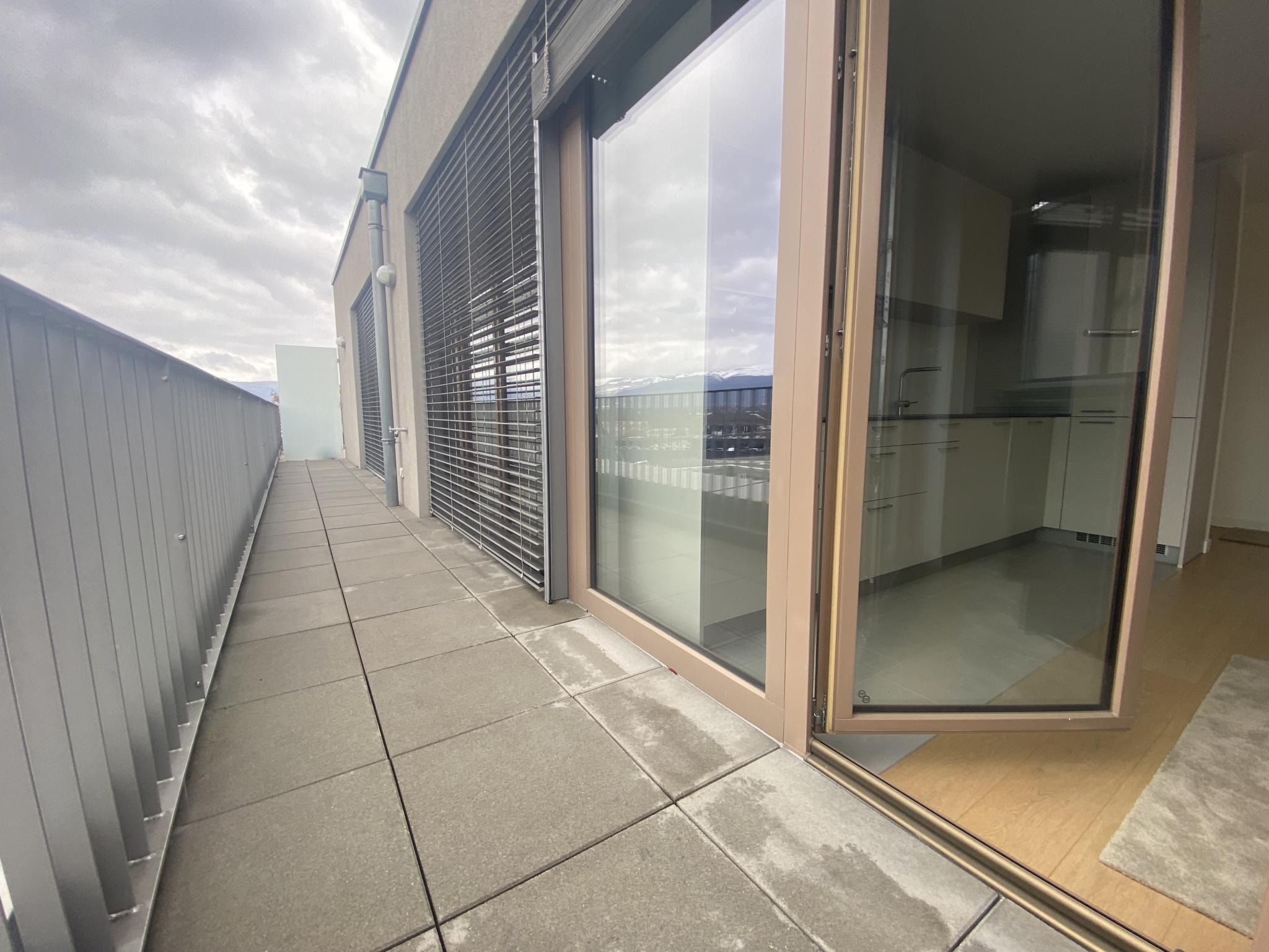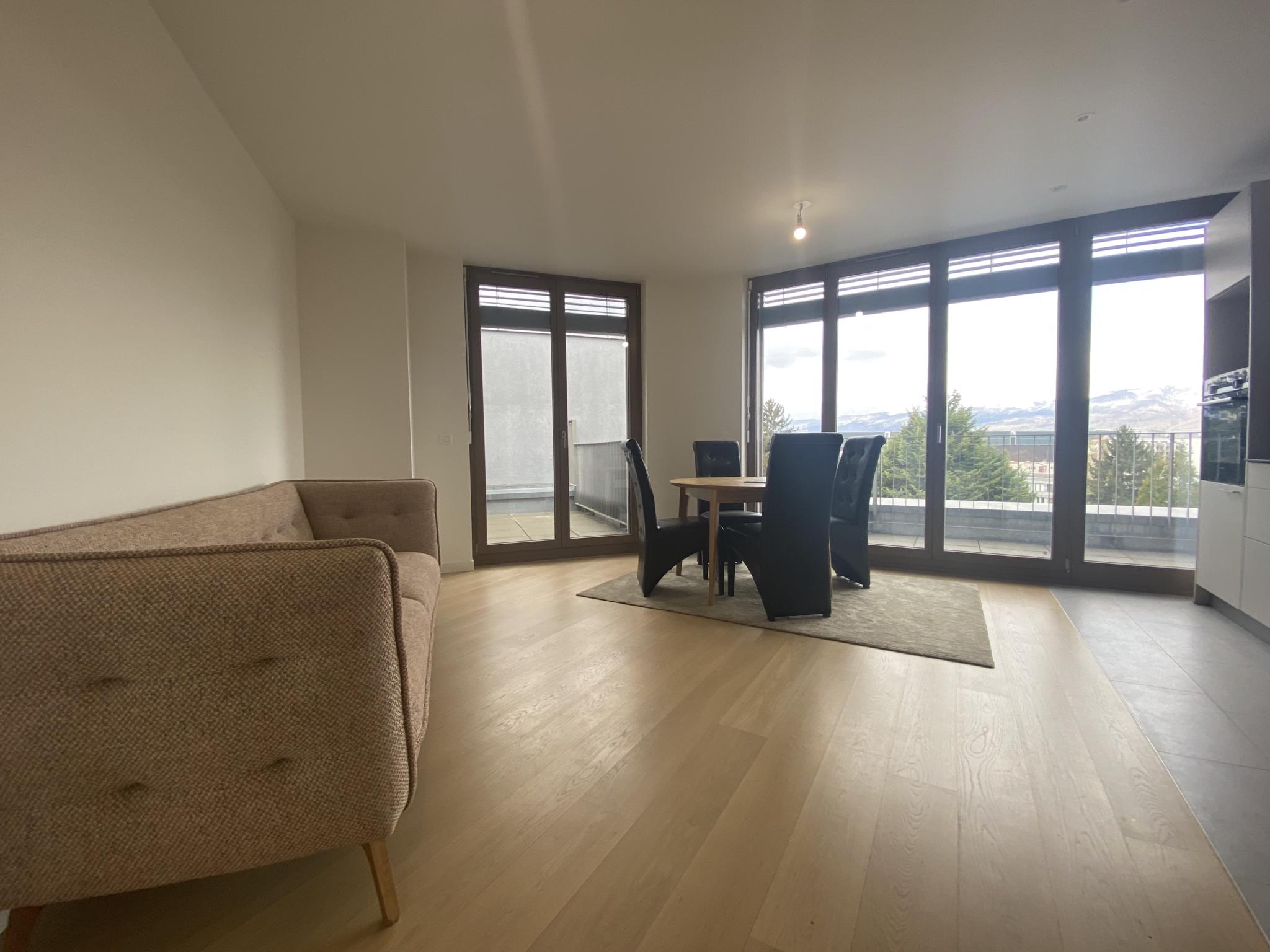 L’espace de vie a été pensé pour une fluidité totale entre intérieur et extérieur : la cuisine, le séjour ainsi que les deux chambres bénéficient d’un accès direct à un large balcon - terrasse de 15,5 m², offrant une vue imprenable sur la chaîne du Jura. Une seconde terrasse de 9 m², aux proportions plus intimes, prolonge harmonieusement le séjour pour des moments de détente en toute saison.