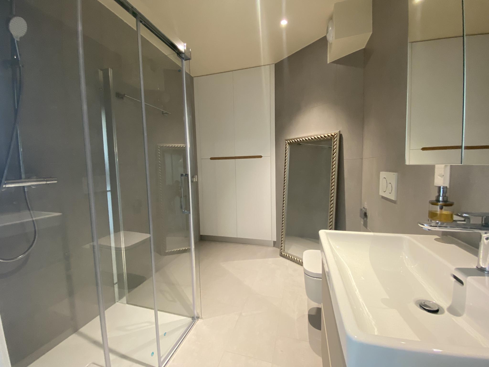 Une attention toute particulière a été portée aux détails architecturaux et à l'exécution technique. La conception intelligente de l'espace se manifeste notamment par des cloisons optimisées dans le hall de distribution, permettant d’intégrer des rangements sur mesure sans perdre de volume habitable. Un soin du détail qui souligne le caractère haut de gamme de cette réalisation.